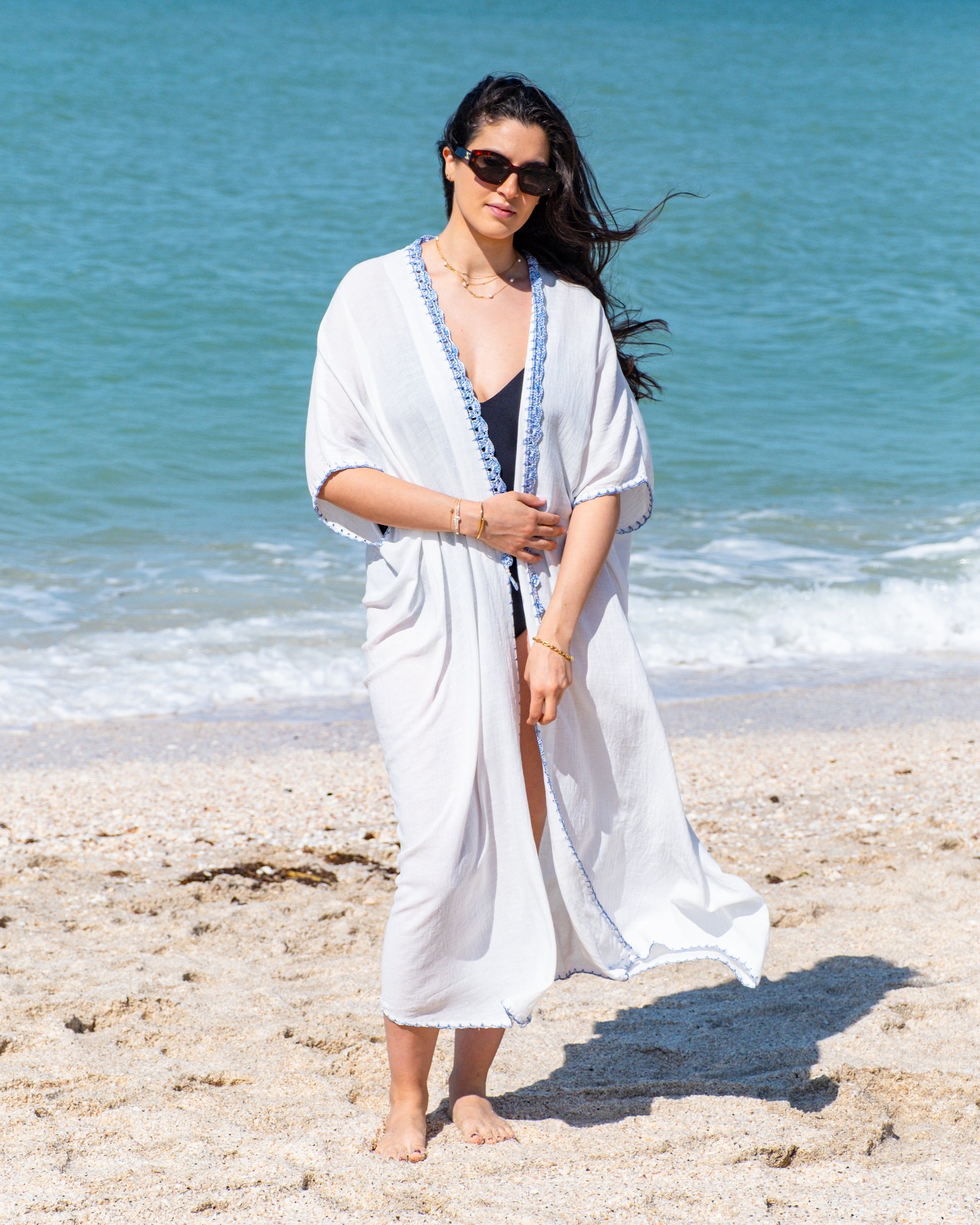 Lightweight breathable gauze, drapes beautifully, perfect for warm days. The hand crocheted starfish motif with shimmering beadwork adds a unique coastal touch.