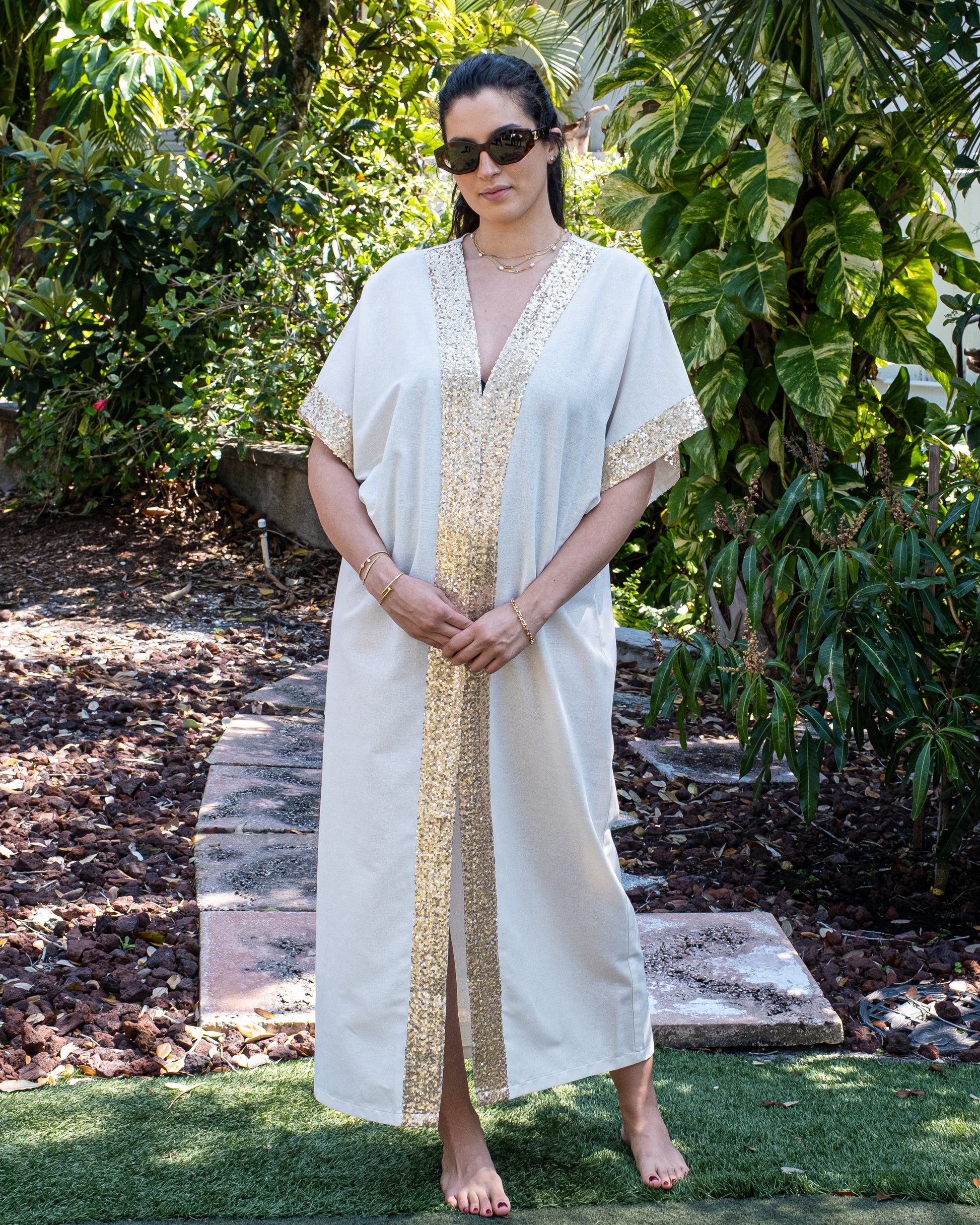 This luxurious Ivory Kaftan intricate gold embellishments at the neckline and sleeves, with a delicate floral sequin motif gracing the back.