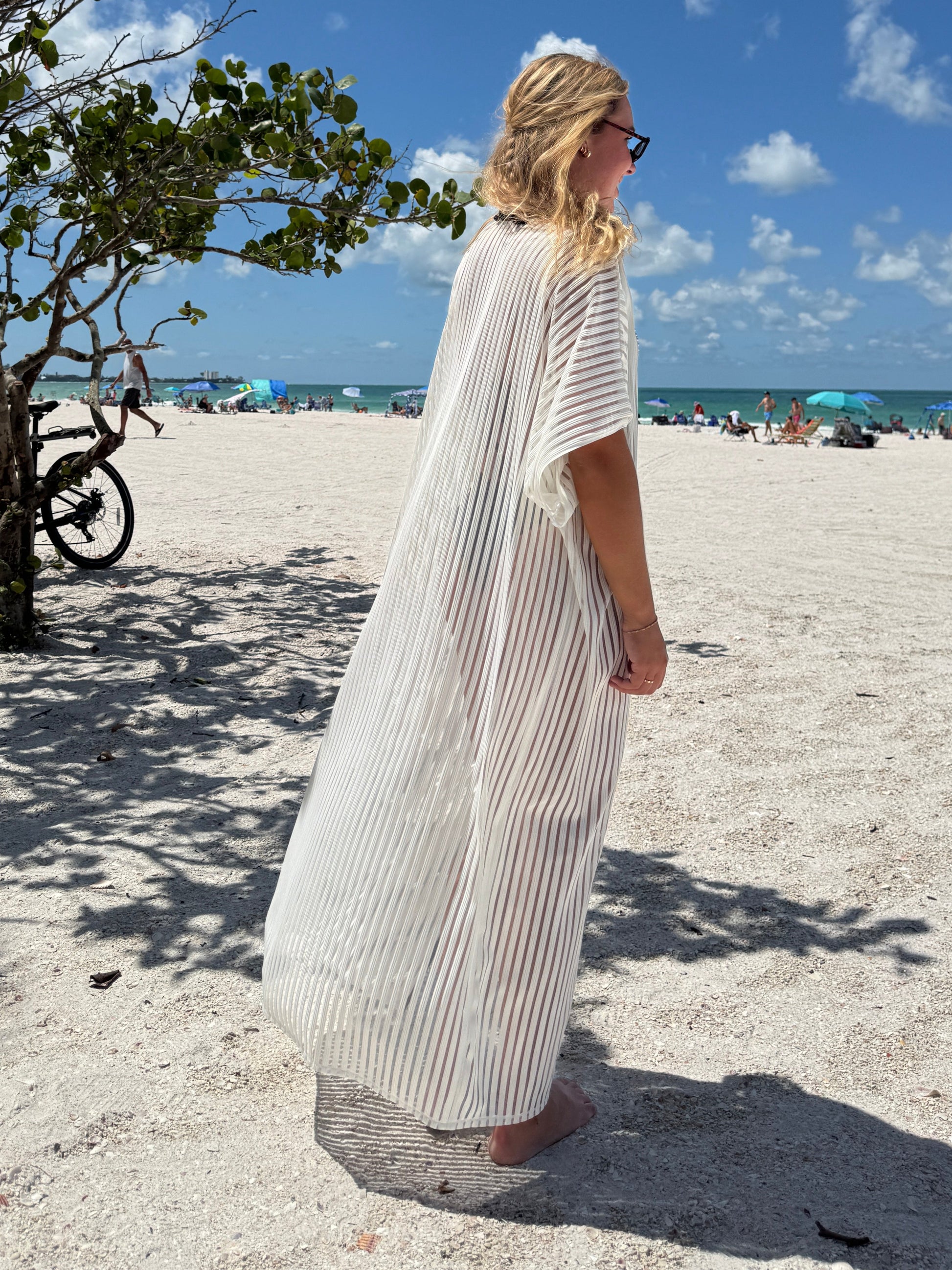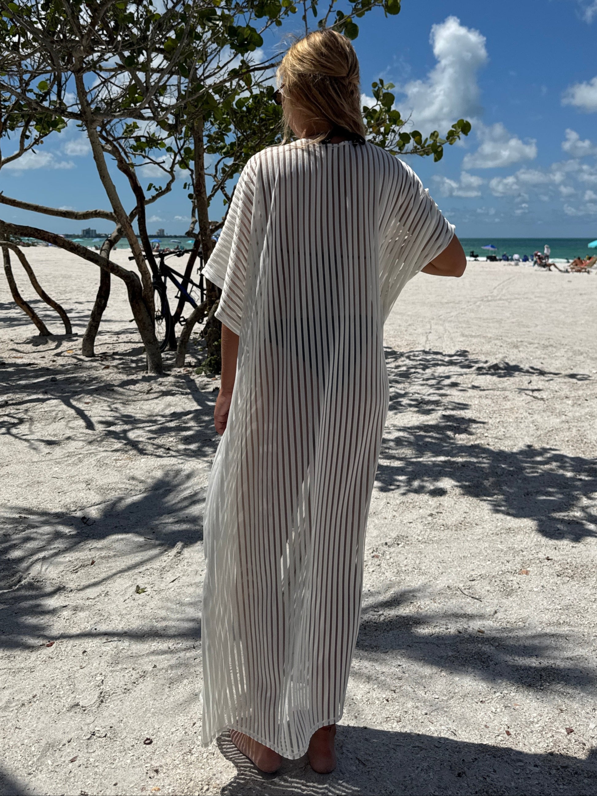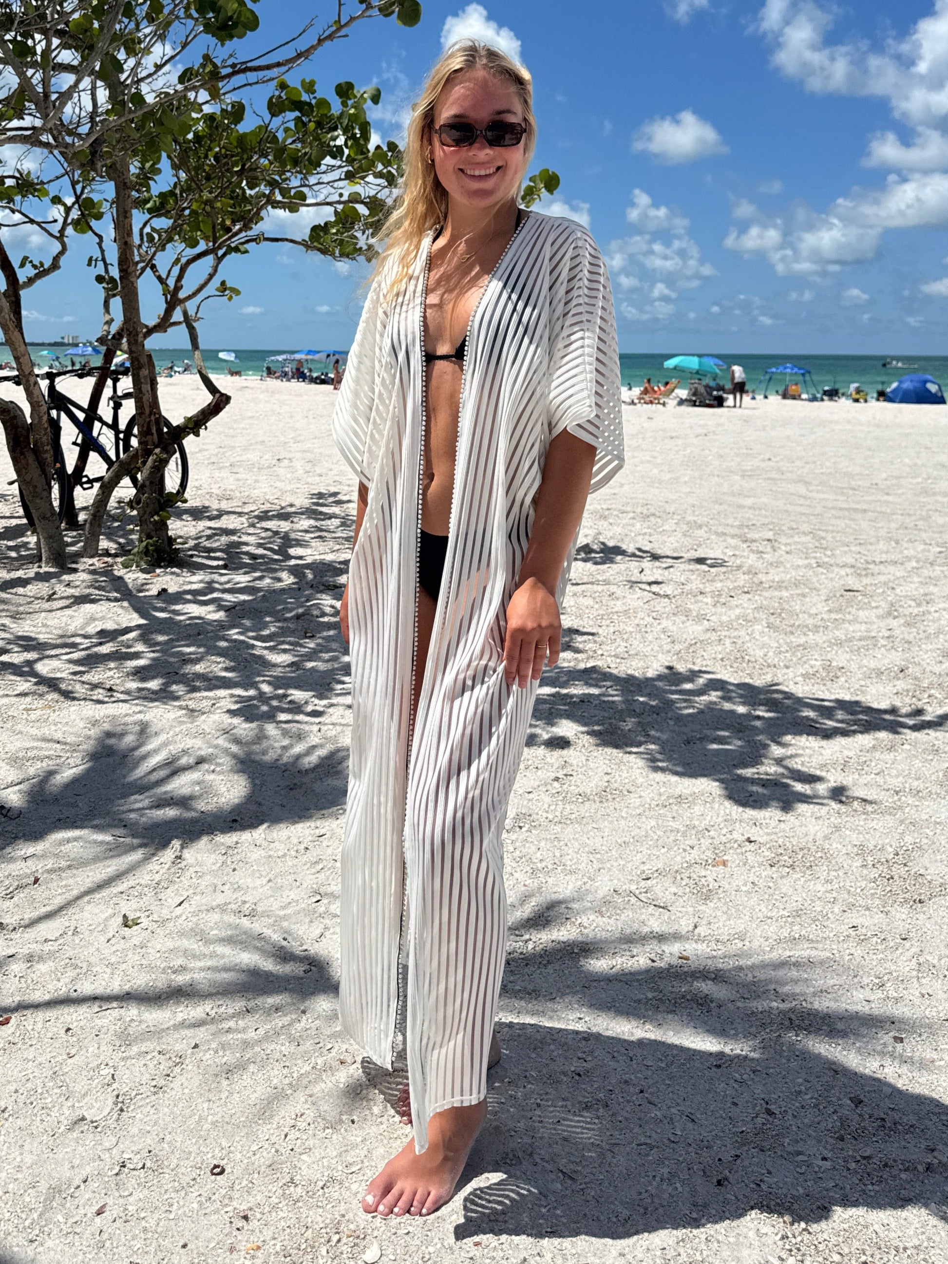 Lightweight and effortlessly elegant ,this striped chiffon cover-up is perfect from Beach to Evening . With relaxed open front and pearls on the trims ,it drapes beautifully over swimwear or a chic night-out look . A coastal luxury essential you'll live in.