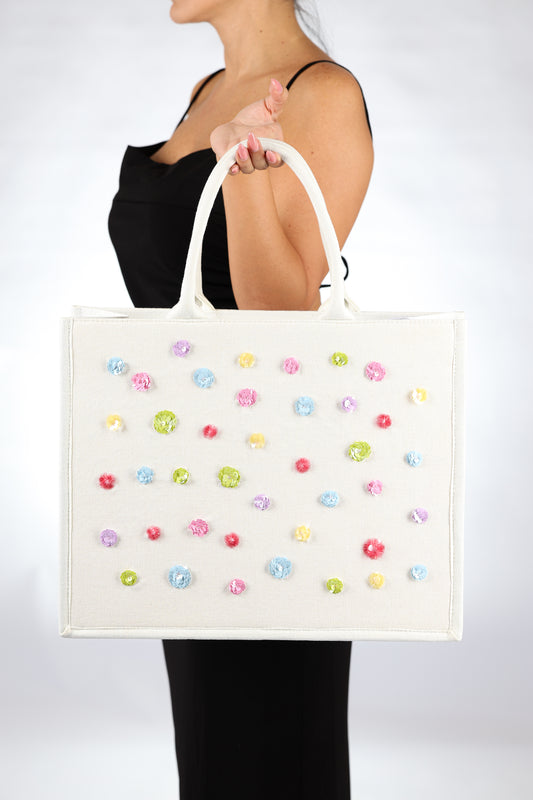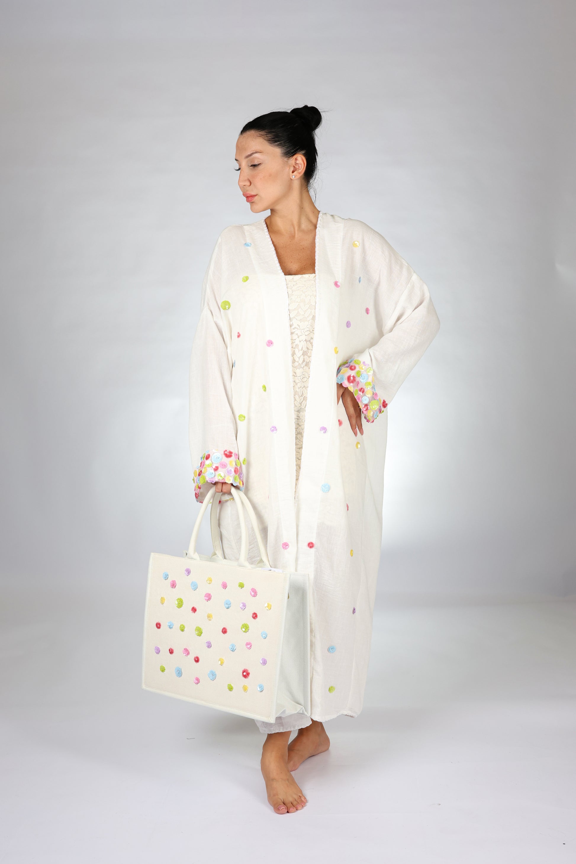 Crafted from a breathable linen-viscose blend that flows effortlessly. Featuring colorful sequin flowers and detailed cuffs . Ideal for resort wear, casual outing or elegant gatherings paired with a matching tote to complete the look with perfect harmony
