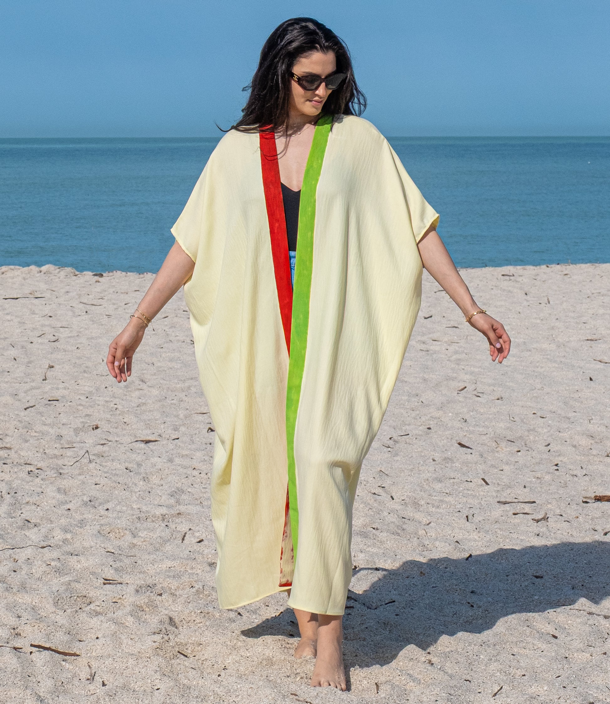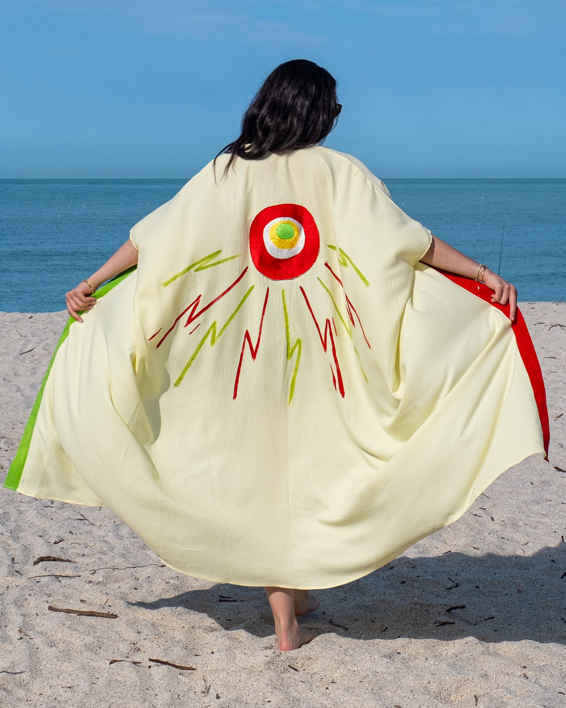This lightweight kaftan features a bold, hand-embroidered sunburst eye motif in red, lime, and yellow, with striking hand-painted accents and a rich neckline finish. Its flowing silhouette brings effortless sophistication to beach days, sunset strolls, or standout resort wear moments.