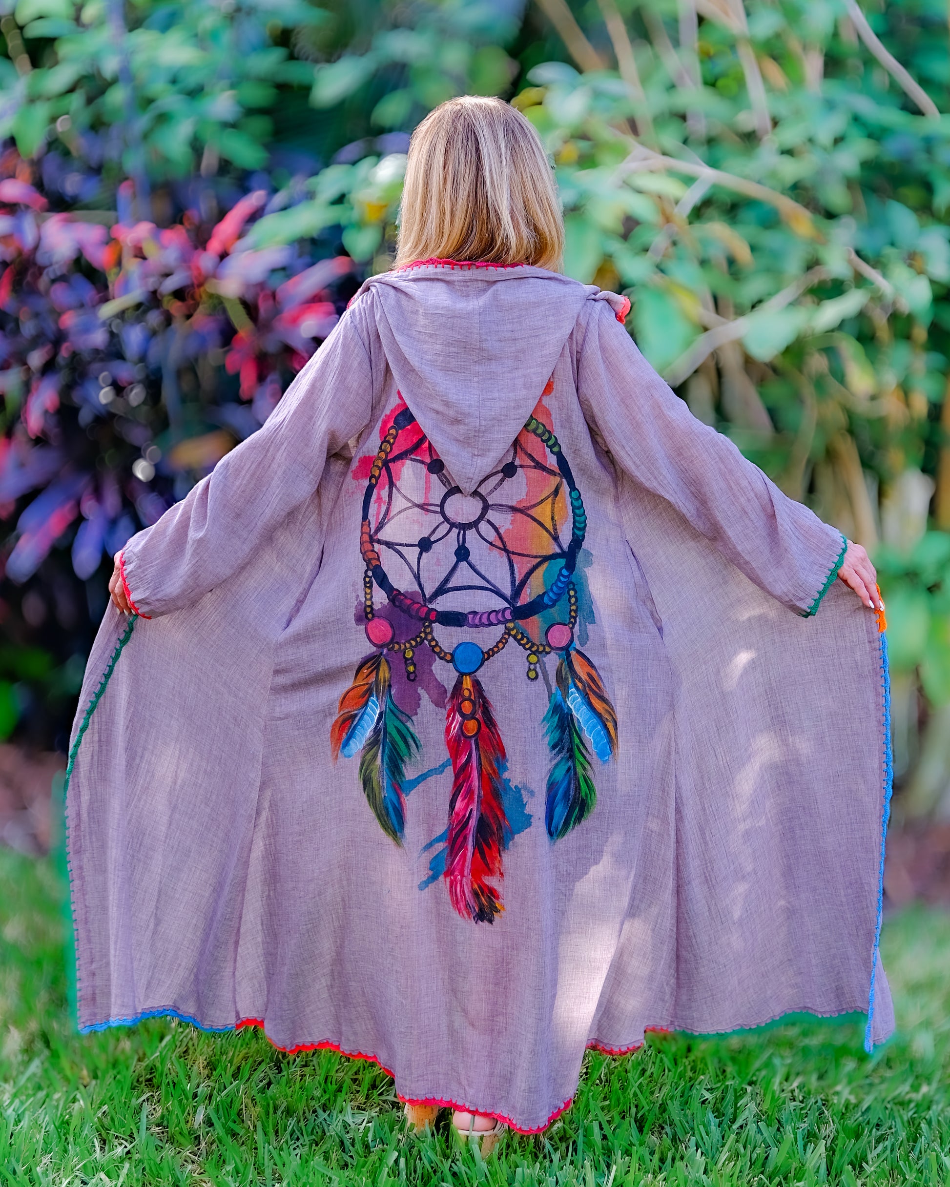 A one-of-a-kind expression of artisanal craftsmanship, this handcrafted hooded kaftan is made from a breathable linen-gauze blend that drapes effortlessly. Featuring a hand-painted dreamcatcher motif in vivid tones and finished with intricate hand-crocheted trims, it brings together comfort, beauty, and individuality in every detail.