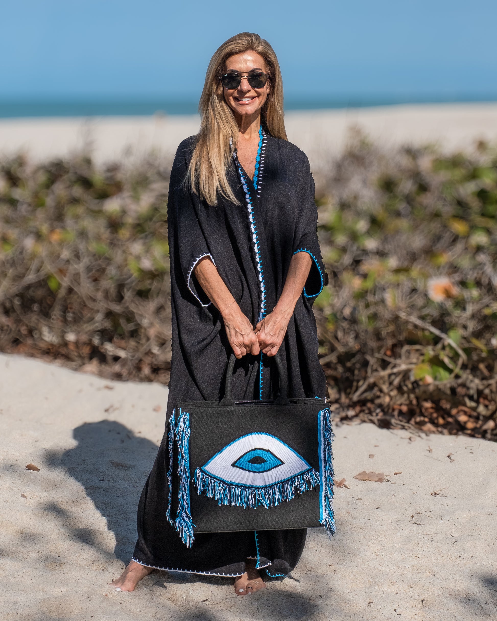 Bold and bohemian ,this black tote features a hand crocheted blue evil eye design and a playful fringe trim, Perfect for stylish days out or beach escapes.