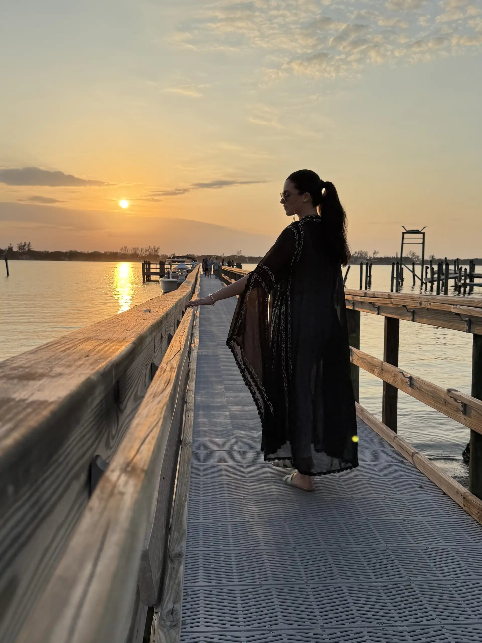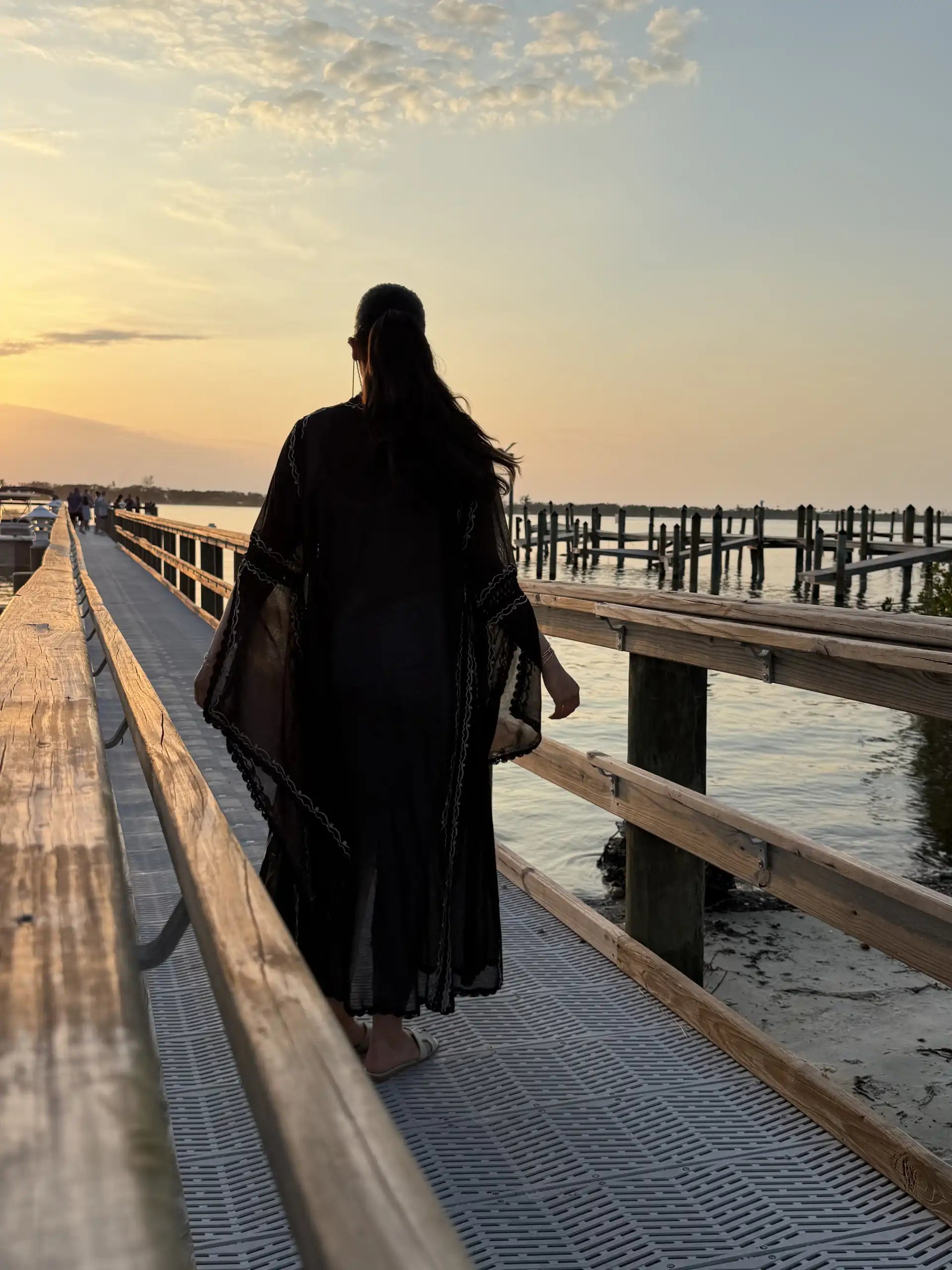 Sheer kimono features delicate Gold embroidery ,flowing sleeves, and crocheted trims adding a touch of effortless elegance. Perfect for layering over resort wear, evening outfits or casual chic looks