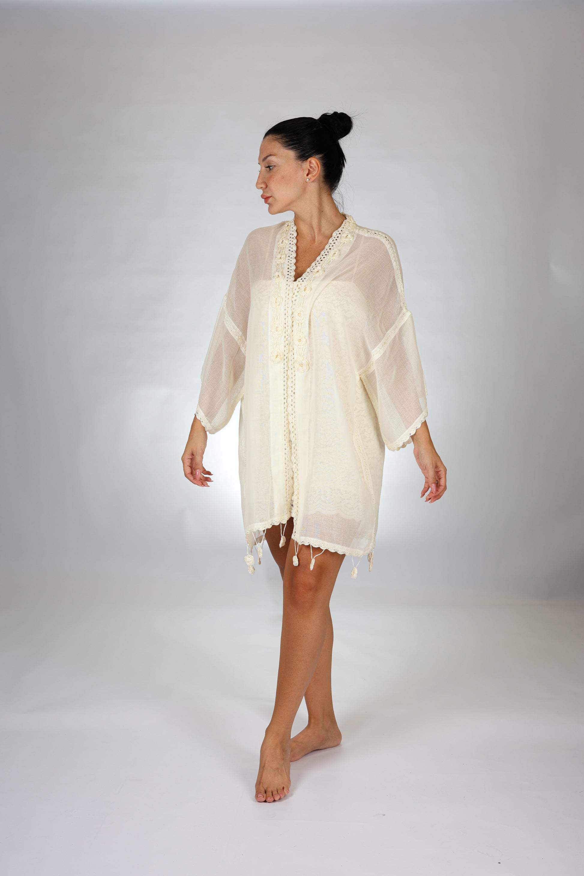 Crafted from a breathable Najaf fabric that flows effortlessly. Featuring delicately with hand-crocheted trims and flower tassel detail along the neckline and sleeves, this lightweight kaftan brings a vibrant, artistic touch to your wardrobe.