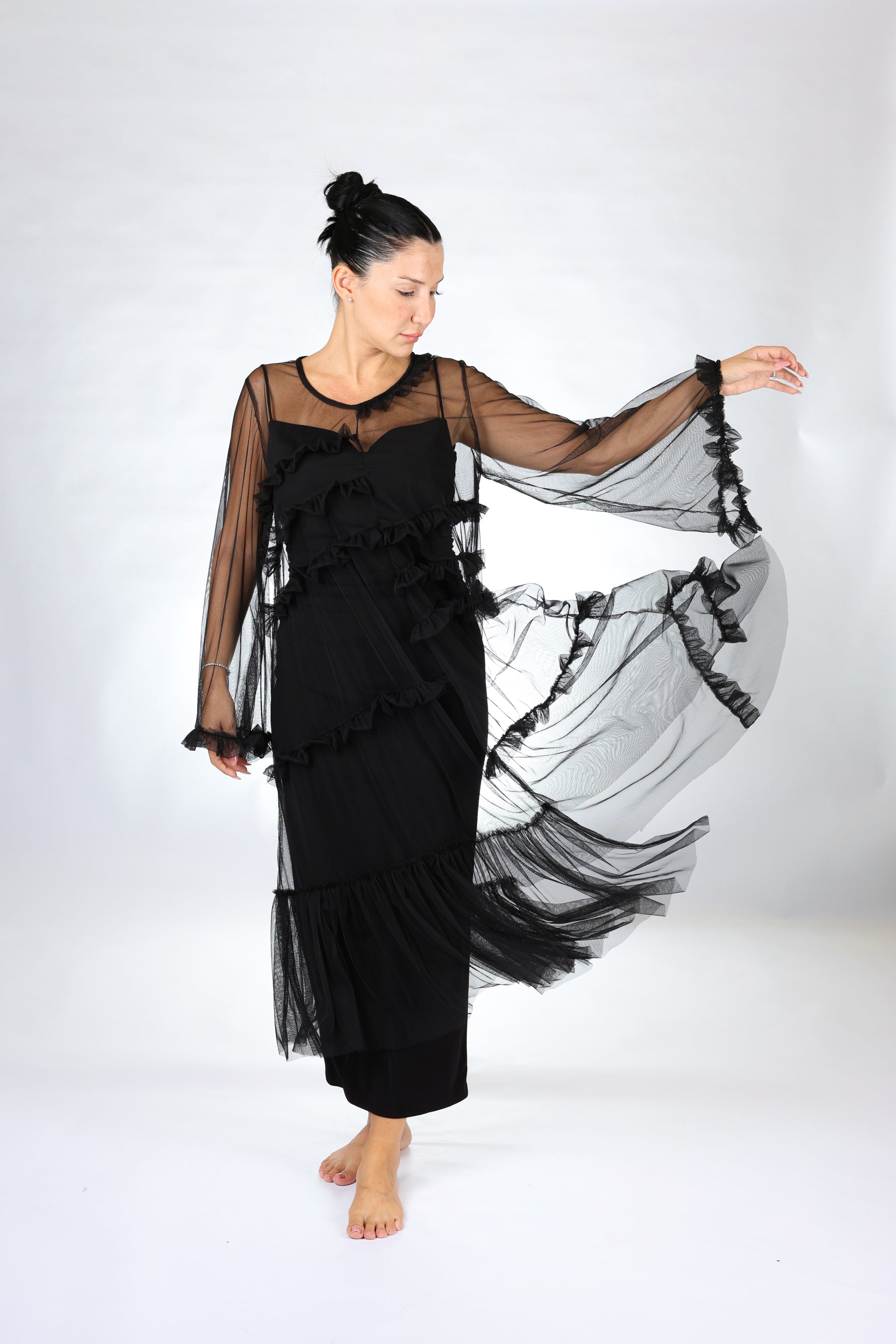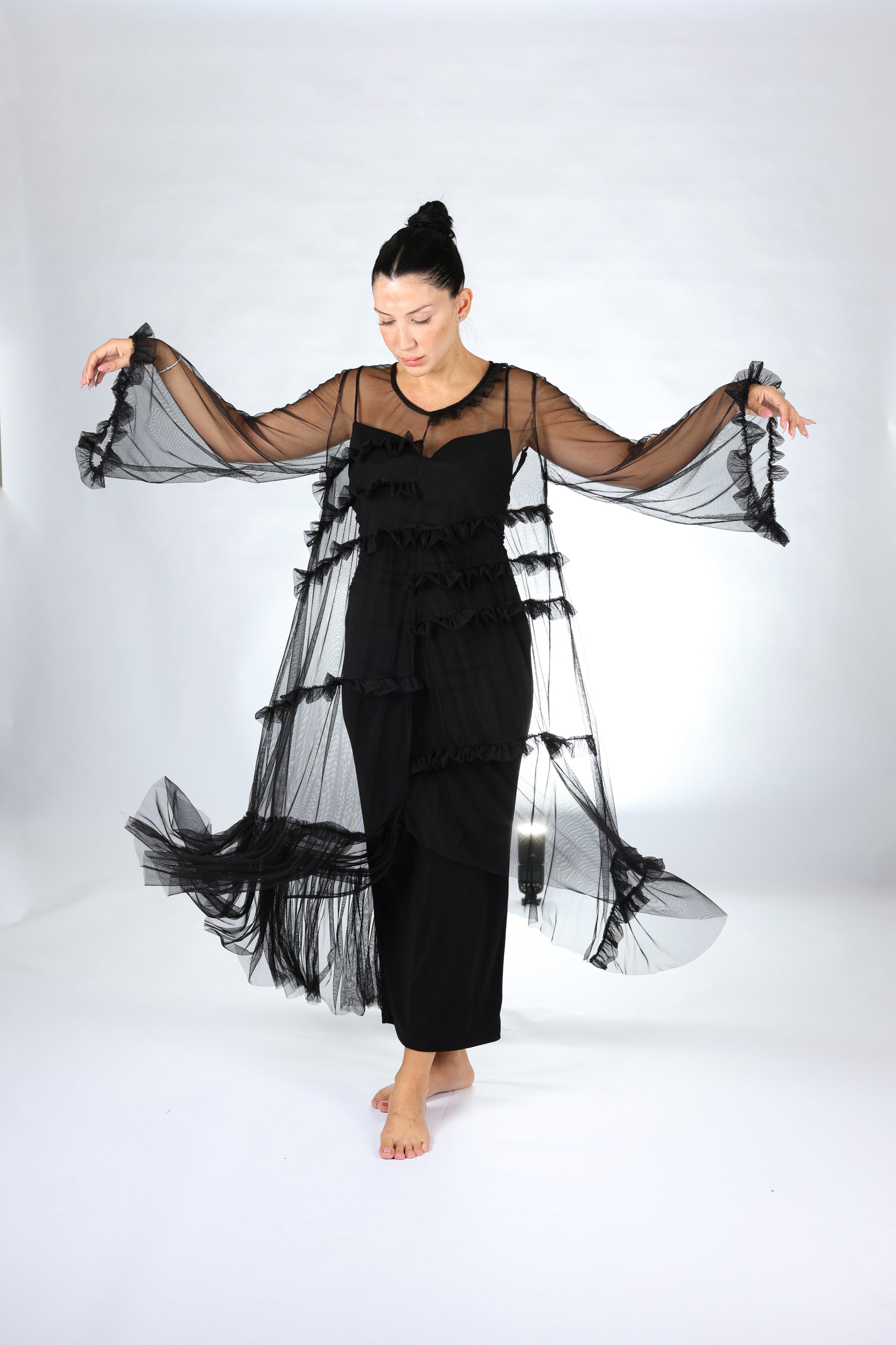 A dreamy sheer tulle Robe that flows effortlessly with every movement. Designed with cascading ruffles and wide bell sleeves , it brings a modern and romantic twist to traditional elegance. Pair it with a sleek dress ,a jumpsuit or even you favorite bathing suit